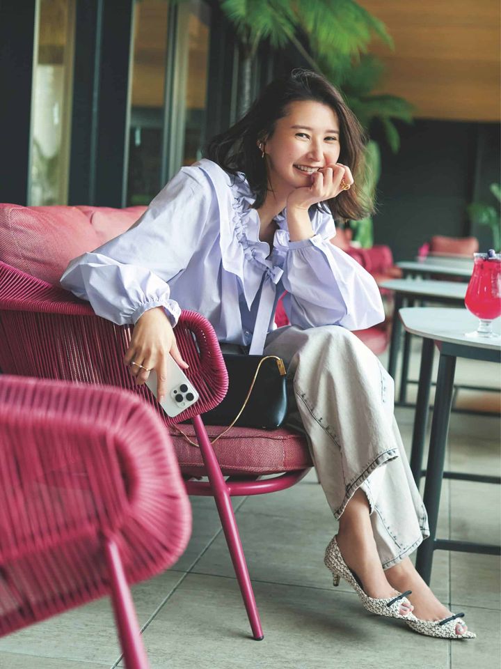 パンプス¥46,200(PIPPICHIC/ベイジュ)ブラウス¥27,940(イウエン マトフ/ユナイテッドアローズ 渋谷スクランブルスクエア店)パンツ¥25,300(アルページュストーリー プレスルーム)バッグ¥75,900(マエストソ/アマン)ピアス¥3,850〈ヘンカ〉リング[左手]¥3,300〈TIGRIS〉リング[右手]¥23,100〈LiiiN〉(すべてロードス)