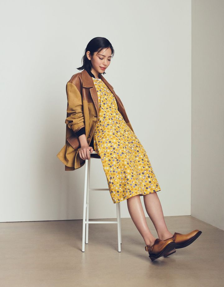 エプロンからインスパイアされたフローラル柄のドレスを主役に、オーバーサイズのスエードジャケットを重ねてレトロなエッセンスをプラス。絶妙なレイヤードのバランスが、新たなフェミニニティを演出します。