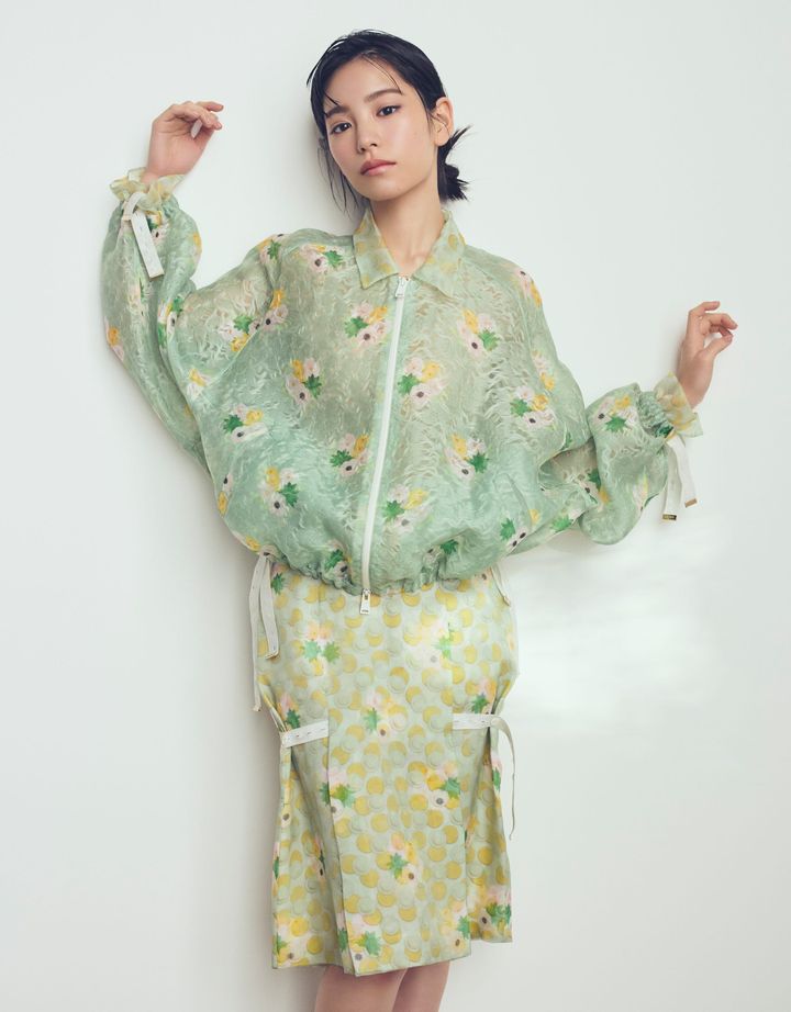 柔らかなグリーンとフローラル柄、シアー素材のプレイフルなレイヤードを楽しめるコーディネート。ポジティブでフレッシュな要素が春夏の軽快なムードを加速させます。ボタンホールゴムやドローストリングなど、遊び心のあるディテールがアクセントに。