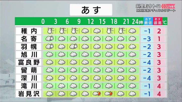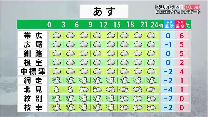 あすもオホーツク海側を中心に大雪や吹雪に注意して下さい。札幌周辺も雪の降る時間があります。気温はきょう12日(木)と同じかやや高いですが、あすも風を通しにくい厚手の上着が必要です。