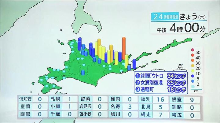 札幌は弱い雪でしたが、道内では局地的な大雪になっています。午後4時までの過去24時間に降った雪の量です。オホーツク海側で量が多くなり、最も多くなった斜里町ウトロは34センチの大雪、紋別でも16センチの雪が降りました。