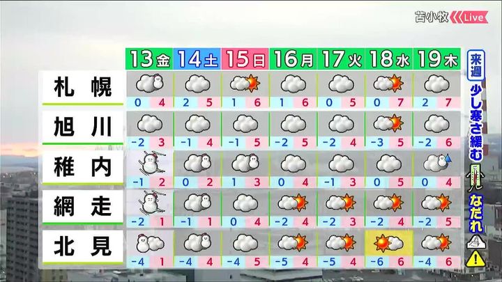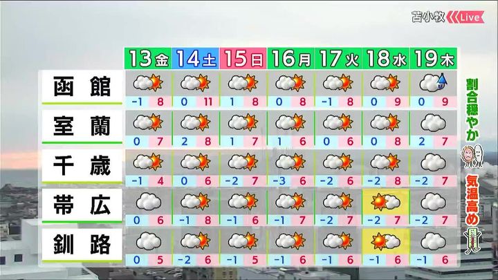 北海道のあす13日(金)の天気と、週間予報を、HBCウェザーセンターの児玉晃(こだま・あきら)気象予報士がお伝えします。