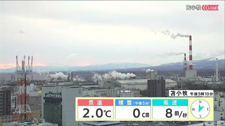 苫小牧の工場の煙突の煙は真横に流れていて、風が強まっていることが分かります。