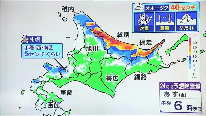今後も同じような場所で雪が降り続きます。これからあす13日(金)午後6時までの24時間予想降雪量です。赤や紫の知床半島周辺や、紋別地方、宗谷南部など多いところ、さらに40センチの大雪です。風が強いためふぶきに、湿った雪が降るため着雪やなだれにも注意して下さい。札幌は手稲区、西区、南区を中心に5センチくらいでしょう。