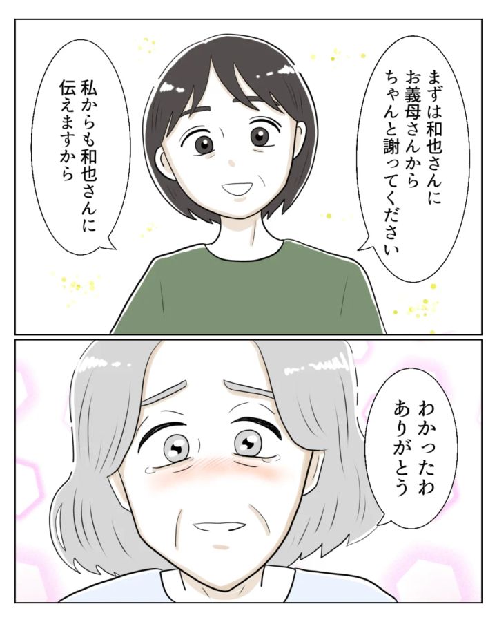 「まずは和也さんにお義母さんからちゃんと謝ってください。私からも和也さんに伝えますから」たか子さんの言葉を聞いて、「わかったわ。ありがとう」と安心したように言いました。