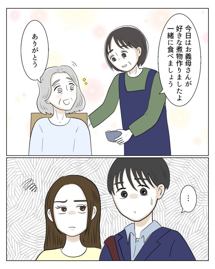 「今日はお義母さんが好きな煮物作りましたよ。一緒に食べましょう」たか子さんにそう言われ、「ありがとう」と笑顔で言う姿を見て、驚く真矢さんと孝介さんは言葉を失いモヤモヤしました。