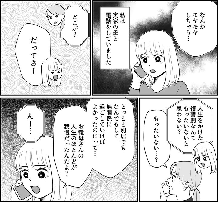 私はどうも釈然とせず……実家の母に電話したのでした。私が感じるモヤモヤを話しても、母は義母の気持ちもわかると言うのです。