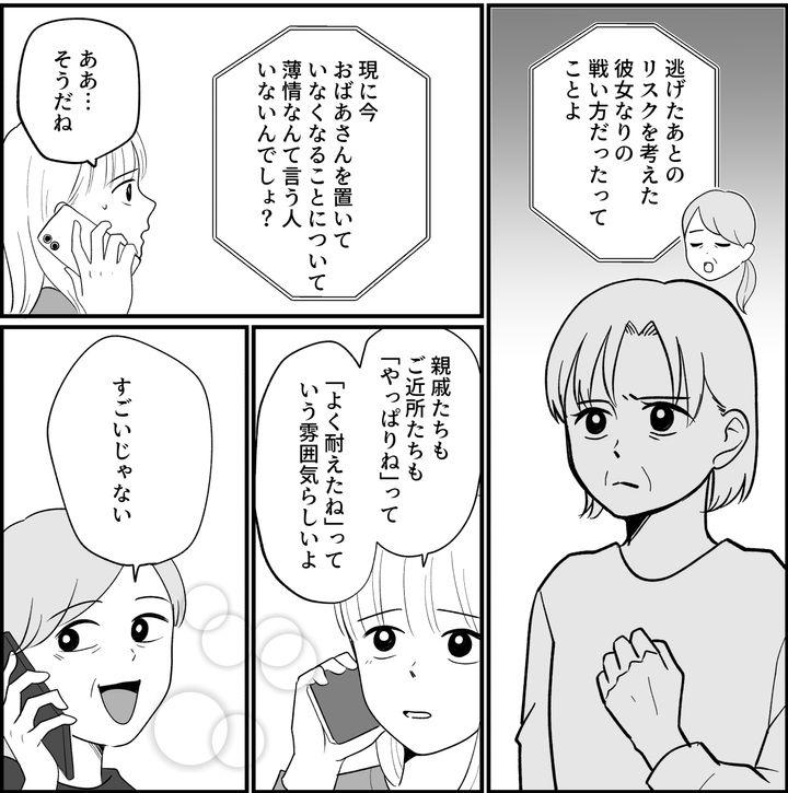 義母は「逃げる」ことを選ばなかった。「逃げたあと」のリスクを考えたとき、「逃げる」ことより、いつか「逃げやすい」方に自分の行動をうつしていこうと決意したのでは? と母は言います。