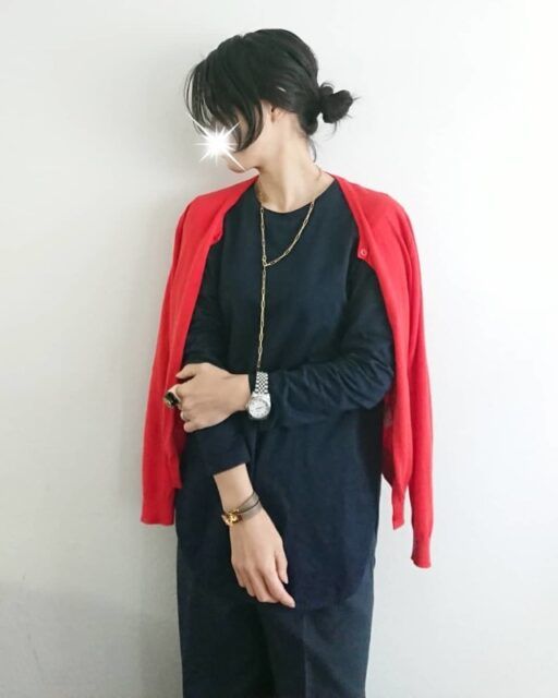 カーディガンにネックレスが合わせにくい主な原因は二つあります。一つ目はカーディガンの前を開けると重ね着が強調される点。二つ目はカーディガンのボタンが縦に並んでいる点。この重ね着・ボタンともに一般的なニットプルオーバーにはない要素で、これだけでも上半身はごちゃごちゃしがち。さらにネックレスを着けるとなったら選び方が難しいんです。