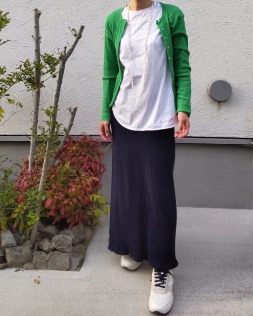 カーディガンの前を開けて「ロングネックレス」を合わせればスッキリとしたコーデに。インナー見せと長いネックレスの合わせ技で縦長ラインが強調され、スタイルアップにも効果を発揮。小柄さんにもおすすめの着こなし方です。