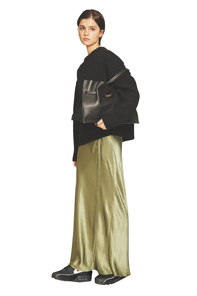 黒スニーカーははきまわし。黒ニットトップス/ハウント/ハウント代官山(ゲストリスト) カーキサイドリボンサテンスカート/メゾンスペシャル(メゾンスペシャル 青山店) イヤカフ(片耳)/e.m.(e.m. 青山店) バッグ/ヴィオラドーロ(ル タロン 有楽町マルイ店)
