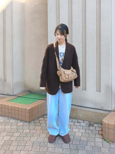 【テーラードジャケットのカジュアルコーデ2】ワイドデニムパンツに合わせる