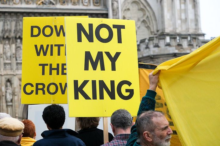 王族方が勢揃いすることが明らかなこの日、ウェストミンスター寺院の前には、プラカードを持った多くの人々が集まり、王族方の到着時にはブーイングも。