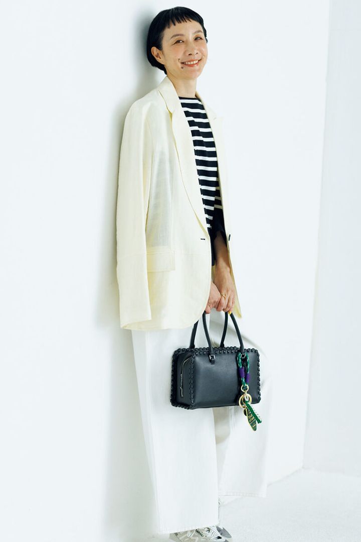 クラフト調のステッチがクラシカルなムードのスクエアボストンを、モノトーンルックに効かせてメリハリアップ。
