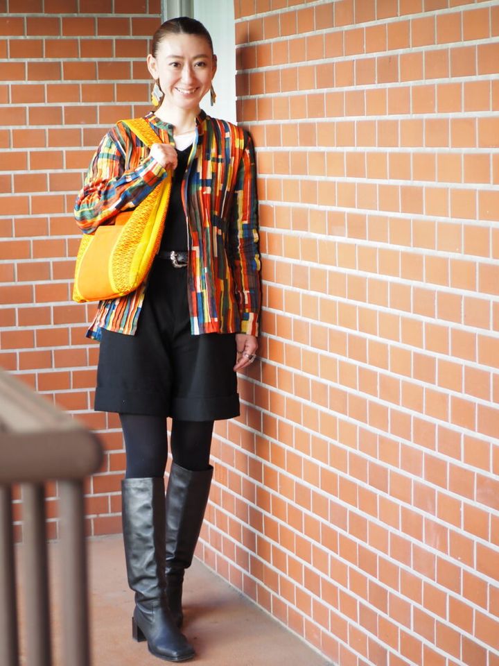 アートをまとうように色使いを楽しむえりかさん。「お気に入りのカラフルなシャツが際立つよう、トップスやパンツは黒で統一しました」。黄色とオレンジを軸にしつつ、ベースカラーでバランスを取る配色テクニックがお見事です!