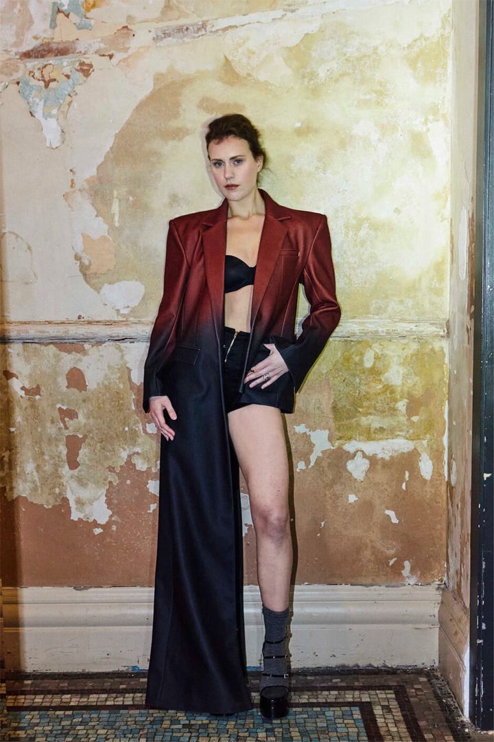 coat by FALVAON, bra by WOLFORD, trousers by LUNATIC FEMME, socks by UNIQLO, shoes by KOI, each ring stylist’s own
