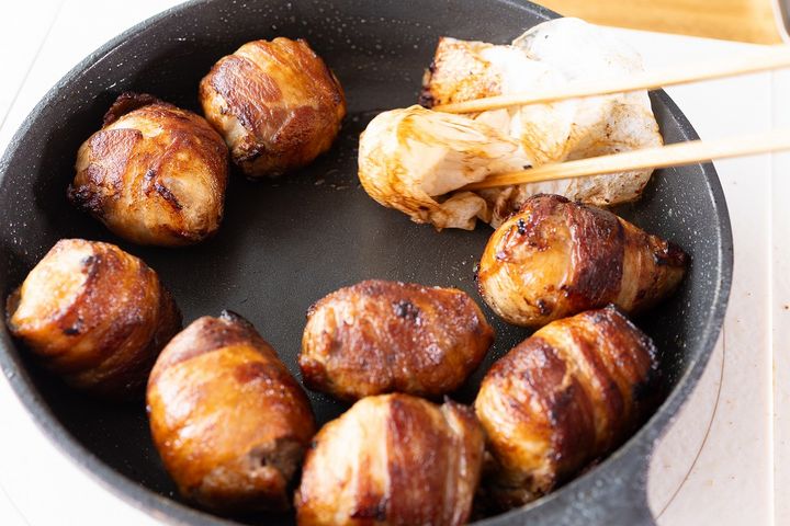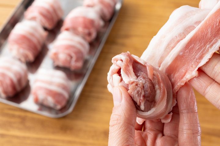 1. 豚こま肉をぎゅっと丸めたものを8個作り、豚バラ肉を外側に巻きつける。