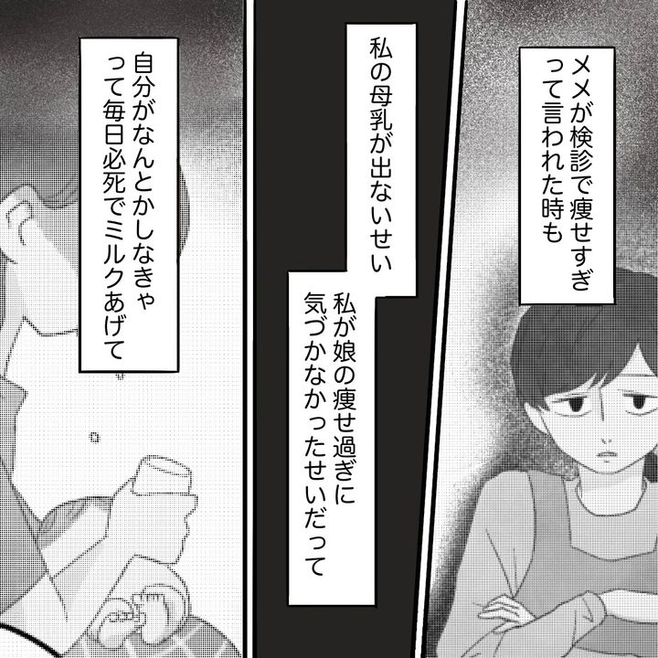 3ヶ月健診で「痩せすぎ」と言われたとき、まろは自分を責めていました。「私の母乳が出ないせい」「私が娘の痩せすぎに気づかなかったせい」だと…。だから必死にミルクをあげようとしました。「このまま痩せ細って死んでしまったらどうしよう」と毎日怖い思いをしながら…。