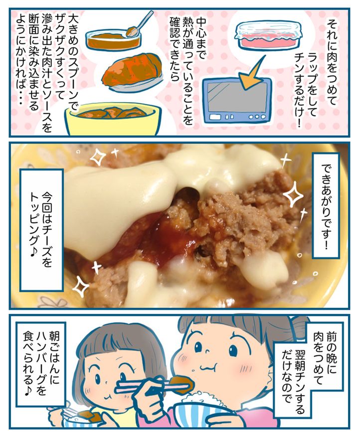 『育児』×『料理』をテーマに、野菜嫌いな長女ちゃんが奇跡的に食べたメニューや、子どもと一緒につくった料理など、チッチママさんのおいしくて愛情たっぷりの食にまつわるストーリーを連載します。思わず食べたくなるおいしそうな料理のイラストにも注目。第58回目は、成形いらずの簡単スコップハンバーグ! 容器に入れてチンするだけだから、朝ごはんにもぴったり。ぜひ挑戦してみてね♪みなさんこんにちは、チッチママです!今回ご紹介するのはハンバーグです。