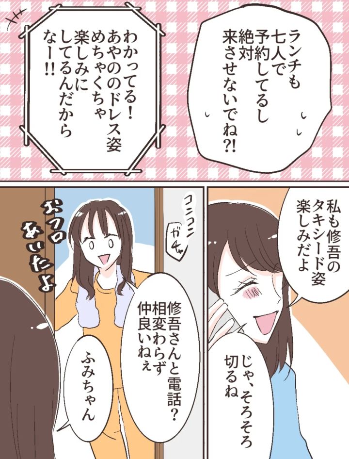 「ランチも7人で予約してるし、絶対来させないでね?!」と念押ししました。ドレス選びは私と修吾、お互いの両親と妹のふみのの7人で行き、終わったらみんなでランチに行く予定になっています。「わかってる!あやののドレス姿めちゃくちゃ楽しみにしてるんだからなー!!」と嬉しそうに修吾が言うので「私も修吾のタキシード姿楽しみだよ」と伝え電話を切りました。ちょうどそこへお風呂上がりのふみのがやってきました。