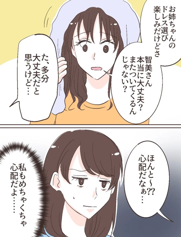 「お姉ちゃんのドレス選び楽しみだけどさ、智美さん本当に大丈夫?またついてくるんじゃない?」と不安を口にするふみのに「た、多分大丈夫だと思うけど・・」と答えつつも正直自信はありません。「ほんと~??心配だなぁ・・」というふみのの言葉を聞きながら「私もめちゃくちゃ心配だよ・・」と心の中で呟きました。結婚の挨拶も両家の顔合わせも智美さんに台無しにされてきました。ドレス選びは絶対に智美さんに邪魔されたくありません。