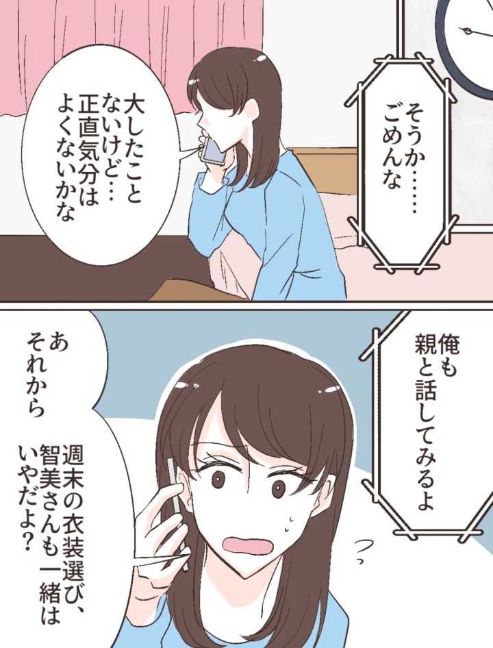 智美さんから手紙が届いていることを修吾に伝えると「ごめんな」と謝ってくれましたが、私は「大したことないけど・・正直気分はよくないかな」と正直に気持ちを伝えました。「俺も親と話してみるよ」と言う修吾に、「あ、それから、週末の衣装選び、智美さんも一緒はいやだよ?」とあらかじめ釘を刺した私は、