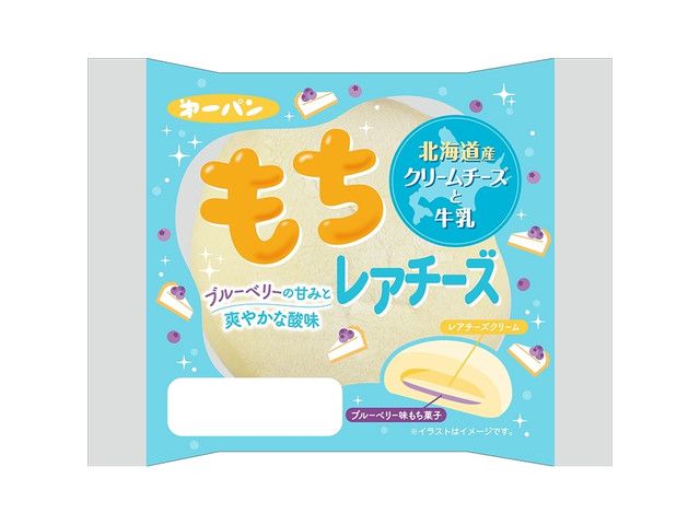 爽やかなレアチーズクリームとブルーベリー味のもち菓子をやわらかな白パン生地で包みました。 カロリー:294kcal 【販売地域】関東・中部・関西・中国・四国