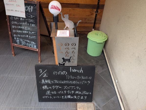 1階の入り口のかわいい猫の看板がビルの目印。 選べるパスタランチのラインナップも確認できます。