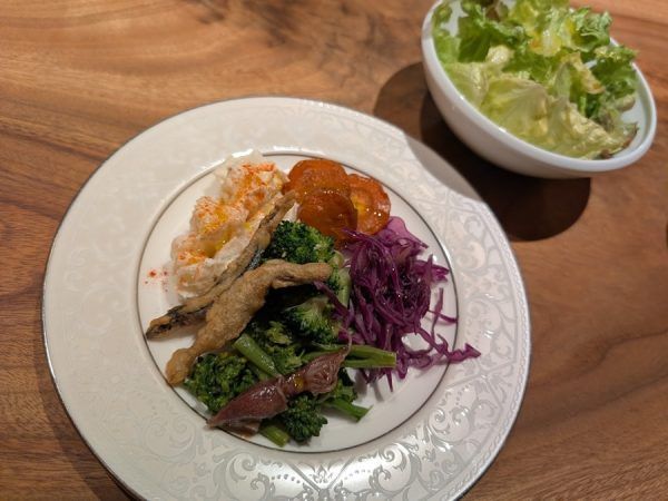 「のべちぇんとのべんたのーべ」さんのランチは「選べるパスタランチ」(1500円)。 来店した日のパスタは「真鯛とフレッシュトマトのオイルパスタ」と「鶏のラグースパゲッティ」。 私は「鶏のラグースパゲッティ」をチョイス。 まずはサラダと前菜。