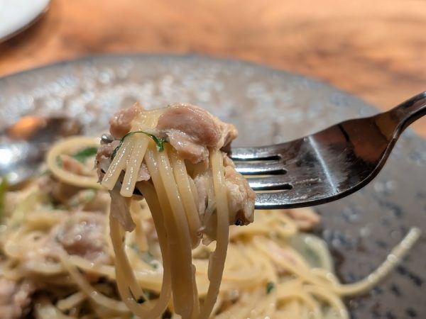 素敵なお皿に盛られたパスタ。 鶏肉もたっぷりで見るからにおいしそう。 さっそくくるくるして一口。