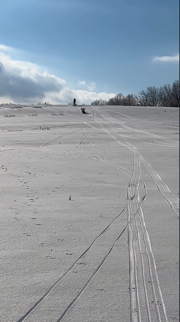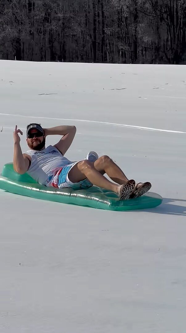 撮影者さんの前を通り過ぎる時に判明した事実。 なんと、ソリではなく、アウトドア用のエアマットに男性が乗っていたのです! しかも、その男性はタンクトップにハーフパンツ姿というまるで夏のような恰好をしているではないですか!!