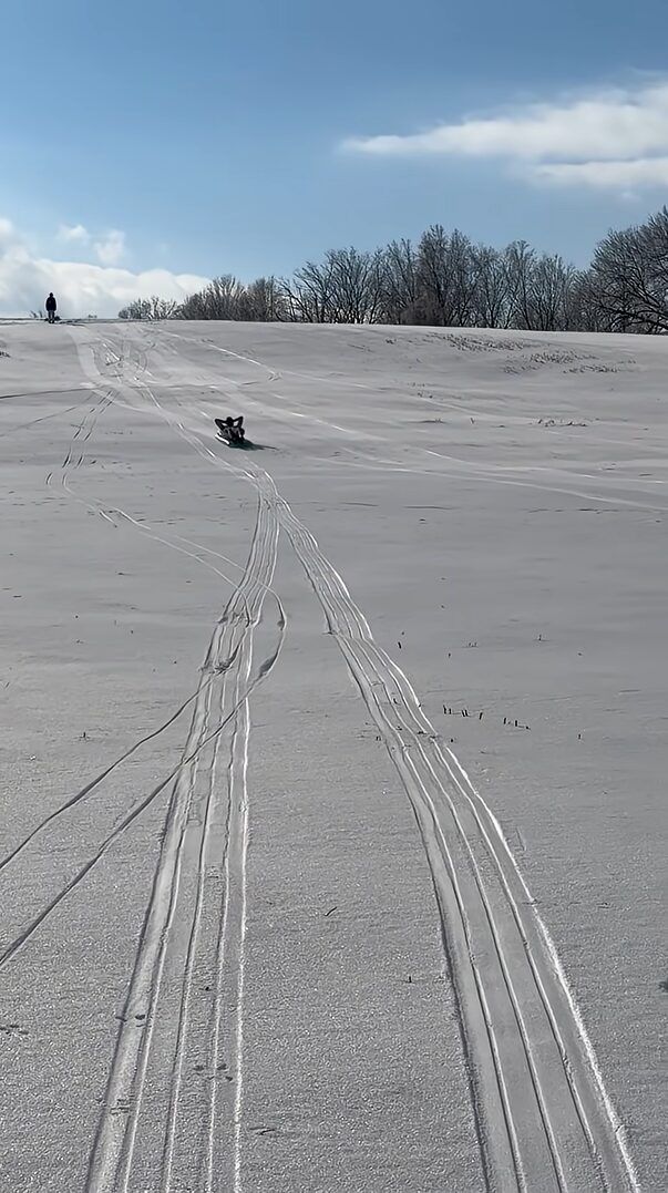 そして、坂の上には人が2人いるようです。 1人が身を屈めると滑り降りてきました。 ソリでもして遊んでいるのでしょうか?