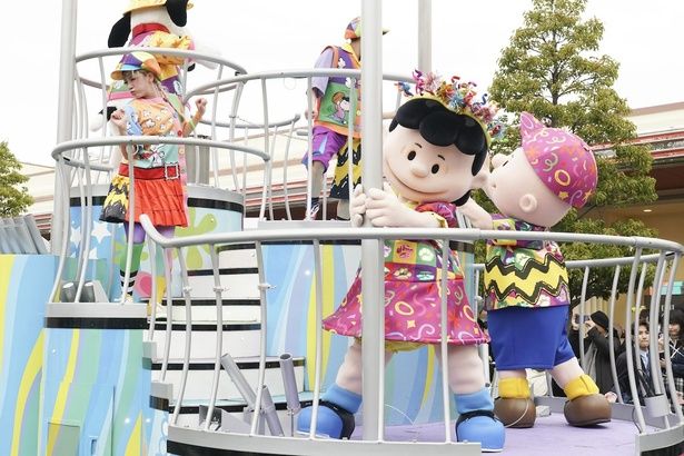 ピーナッツの仲間たちは、明るいカラーにクラッカーの紙テープや肉球が散りばめられた柄で元気いっぱい。エンターテイナーの衣装も帽子からタイツまで色とりどりで、スヌーピーたちキャラクターが描かれたスペシャル仕様になっている。