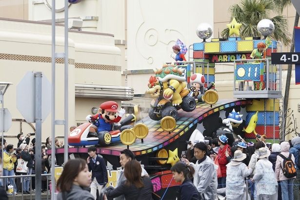 マリオカートのレースが繰り広げられているフロート前には、クリスタルカラーのハテナブロックが登場。レインボーロードを駆け抜けるキャラクターたちの世界を、さらに身近に感じられる。