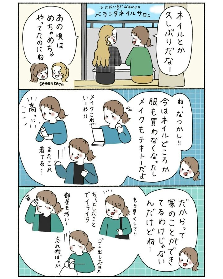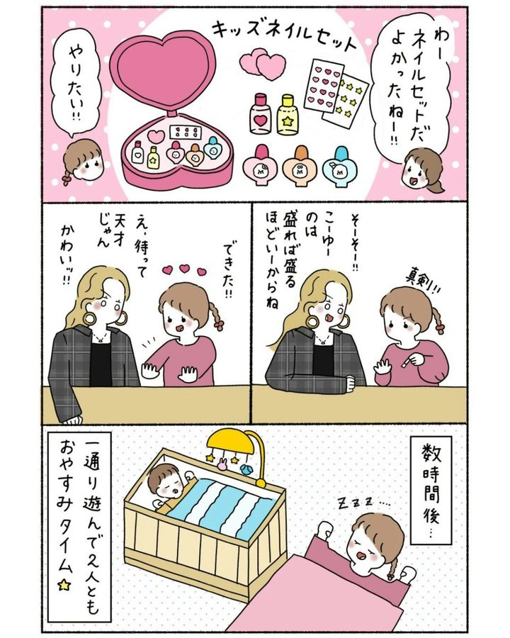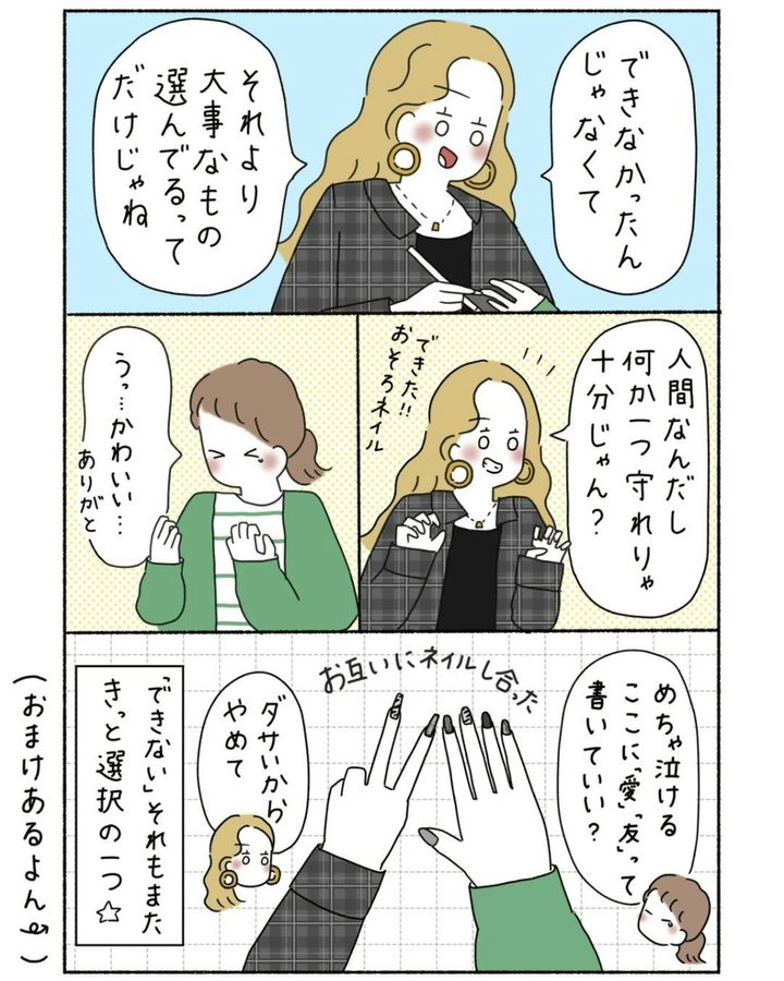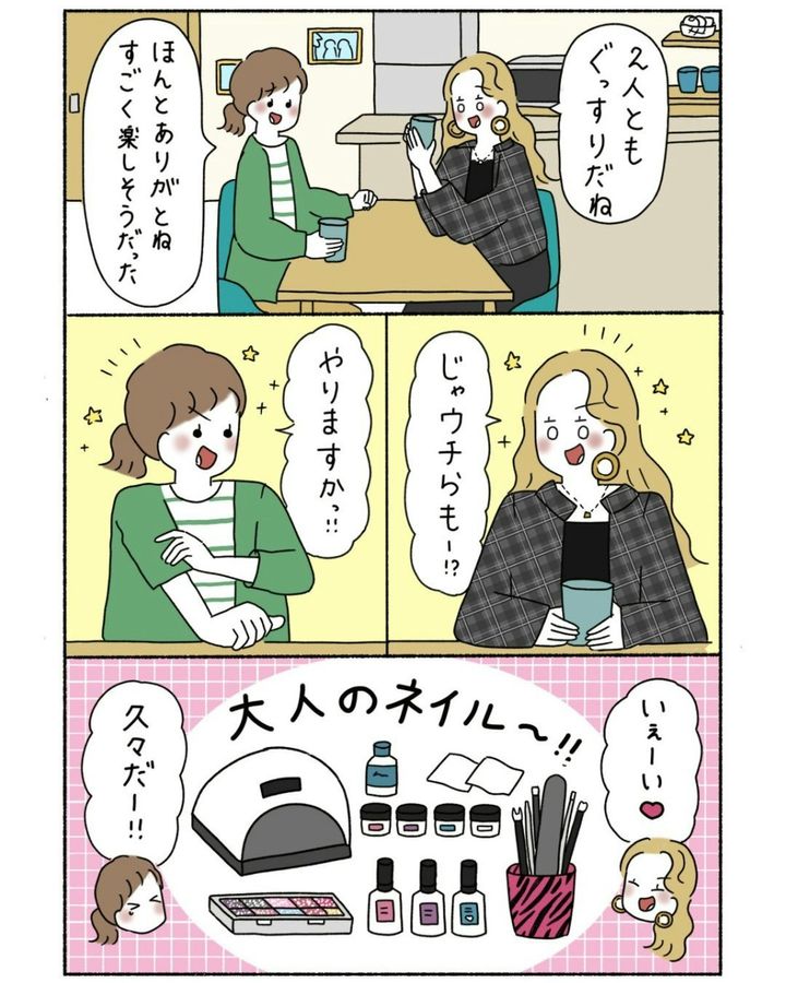 子どもと楽しく遊んだあと、子どもはおやすみタイムにはいります。今度は友人同士で「大人のネイル時間」を満喫。本格的なネイルセットで二人はテンション爆上げです。ついつい昔の自分たちを思い出し、感慨深い思いに浸ります。「できなかったんじゃなくてそれより大事なもの選んでる」というこの言葉、胸にじーんときますよね。育児や家事で忙しい毎日で、できなくなったことはたくさんある。でもそれはきっと「大事なものを選んできた証拠」です。