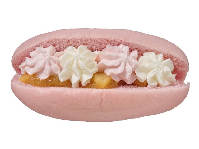 ピンクのコッペパンにピンクと白のマスカルポーネクリーム、黄桃ソースを組み合わせた、甘くてかわいい仕立てです。 カロリー:244kcal 【販売地域】東北、関東、甲信越、北陸、東海、近畿、中国、四国、九州、沖縄