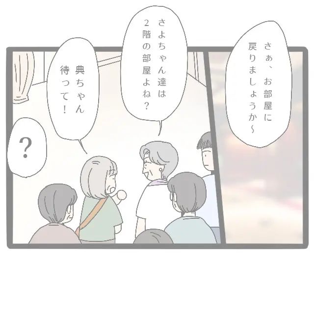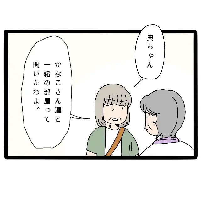 さよさんは義母を呼び止めると、「典ちゃん、かなこさんたちと一緒の部屋って聞いたわよ」と真剣な表情で言いました。どうやら、困っている私を気遣って、義母に一言伝えてくれるみたいです。