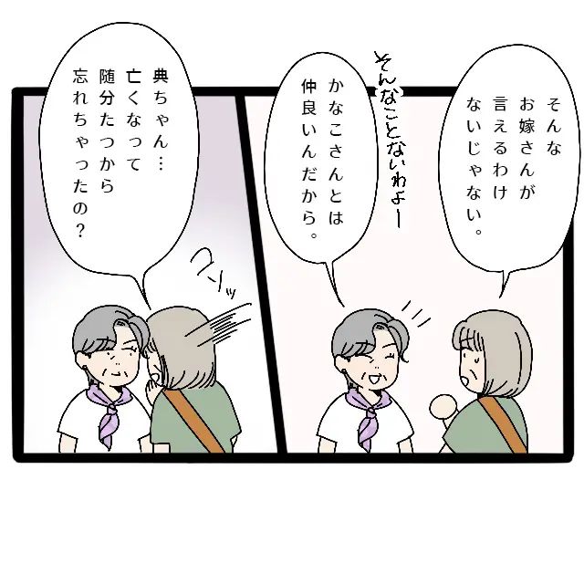 「そんなお嫁さんが言えるわけないじゃない」さよさんがそう言っても、義母はピンときていない様子。「そんなことないわよ、かなこさんとは仲良いんだから」と笑って済ませようとします。するとさよさんは、ふっと声を落として「典ちゃん・・・亡くなって随分たつから忘れちゃったの?」と義母に耳打ちしました。