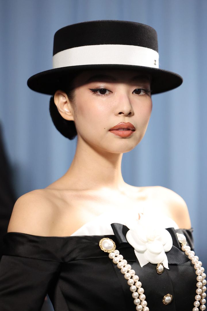 3度目の出席となったメットガラ2025では、シャネルのカスタムルックでレッドカーペットを沸かせたジェニー。ハットに合わせてすっきりとまとめたヘアは、背後から見ると特大リボンにアレンジされており、バックスタイルまで抜かりない。ブラウンのリップペンシルで上唇をオーバーに縁取り、口角の延長線上にほくろを描いた、往年の映画スターを思わせるようなクラシックなメイクまでパーフェクト。