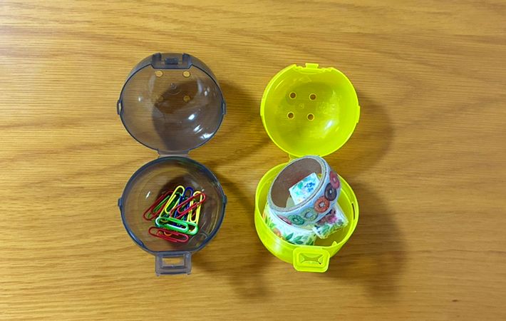 2つのカプセル容器に、クリップとマスキングテープを入れてみました。