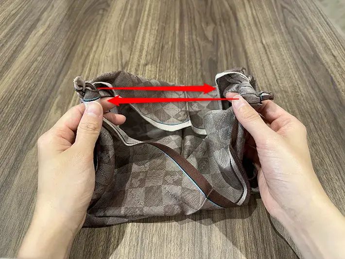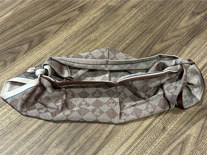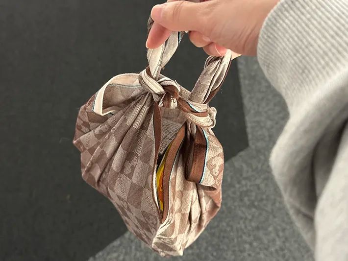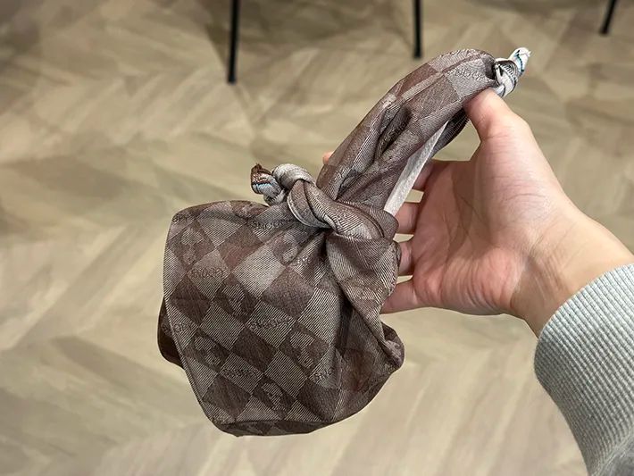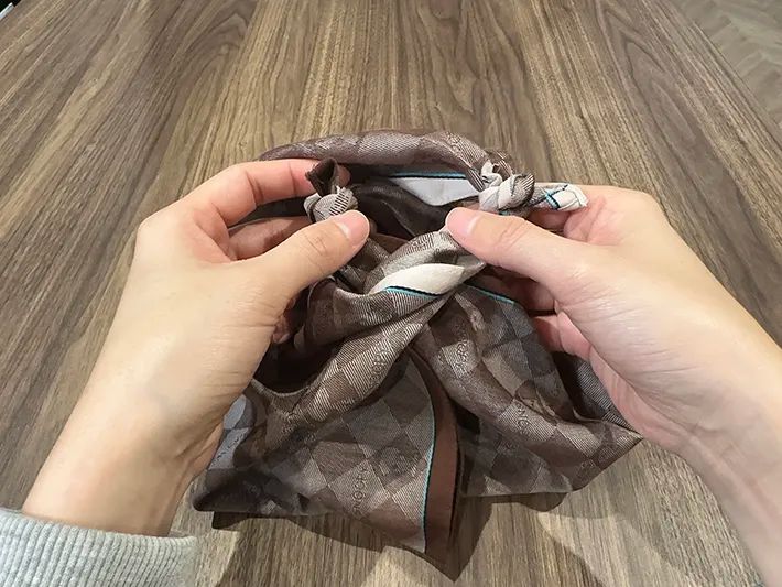 ハンカチのエコバッグで商品を持ち運ぶ際は、両端をしっかりと固結びした後、荷物を入れてもほどけないかをその場で確認してから移動するのがおすすめです。