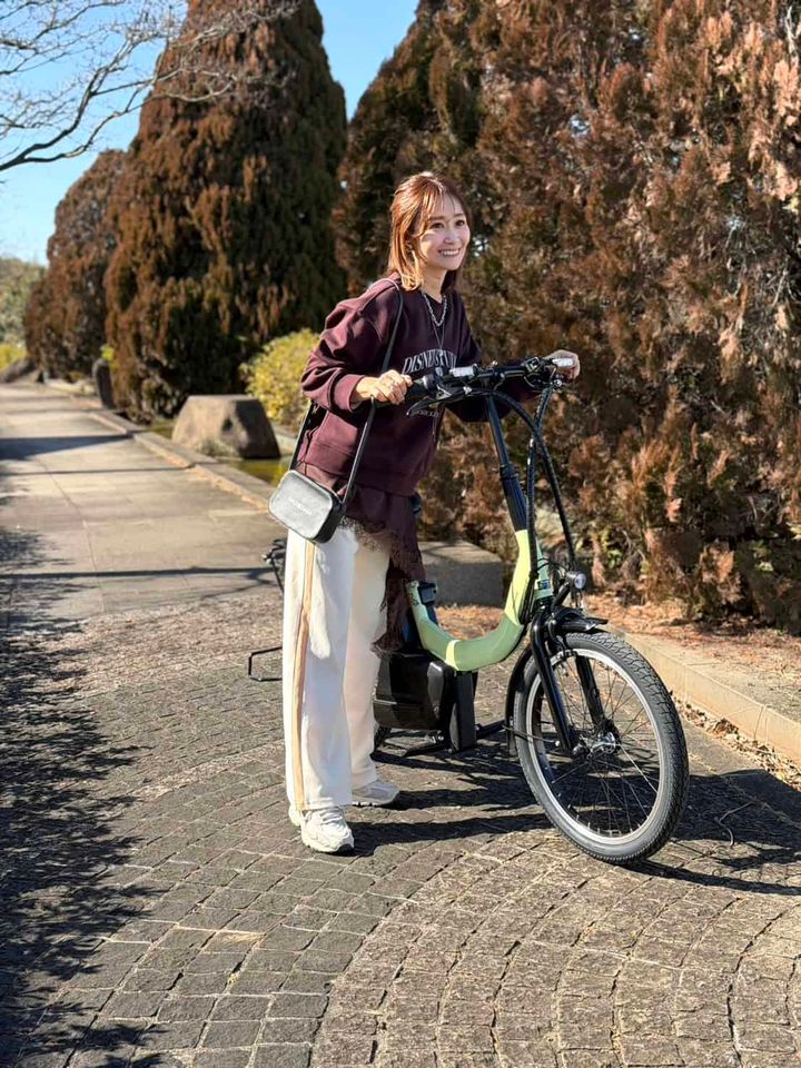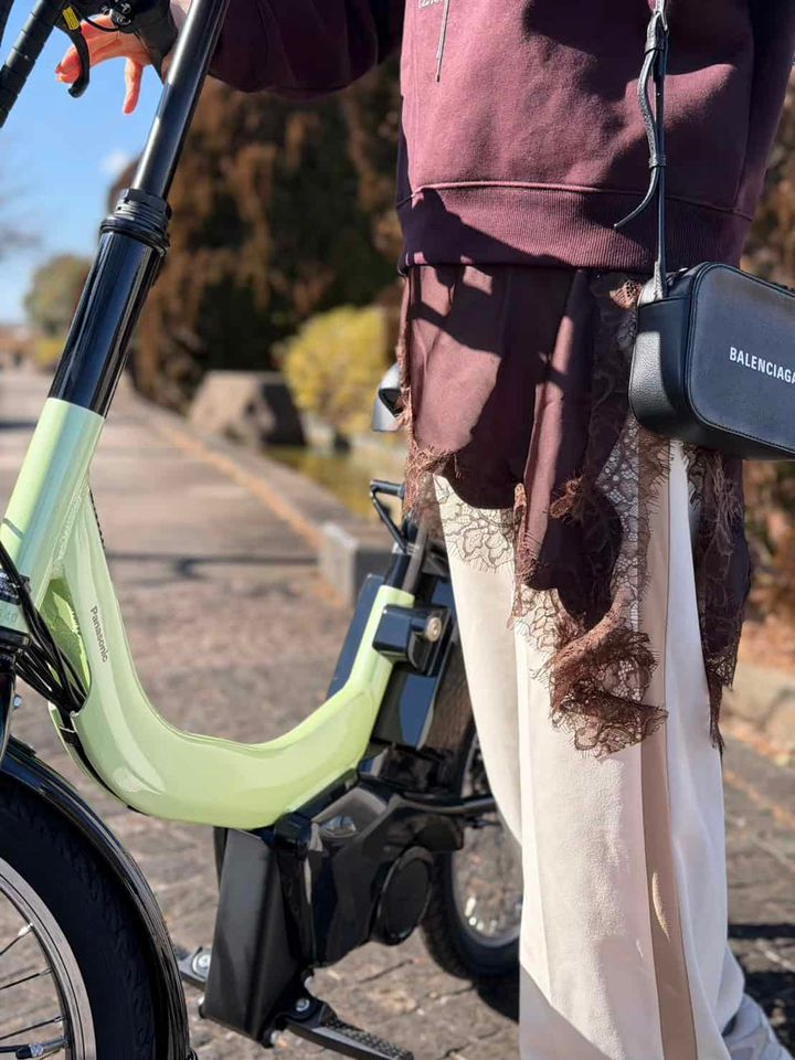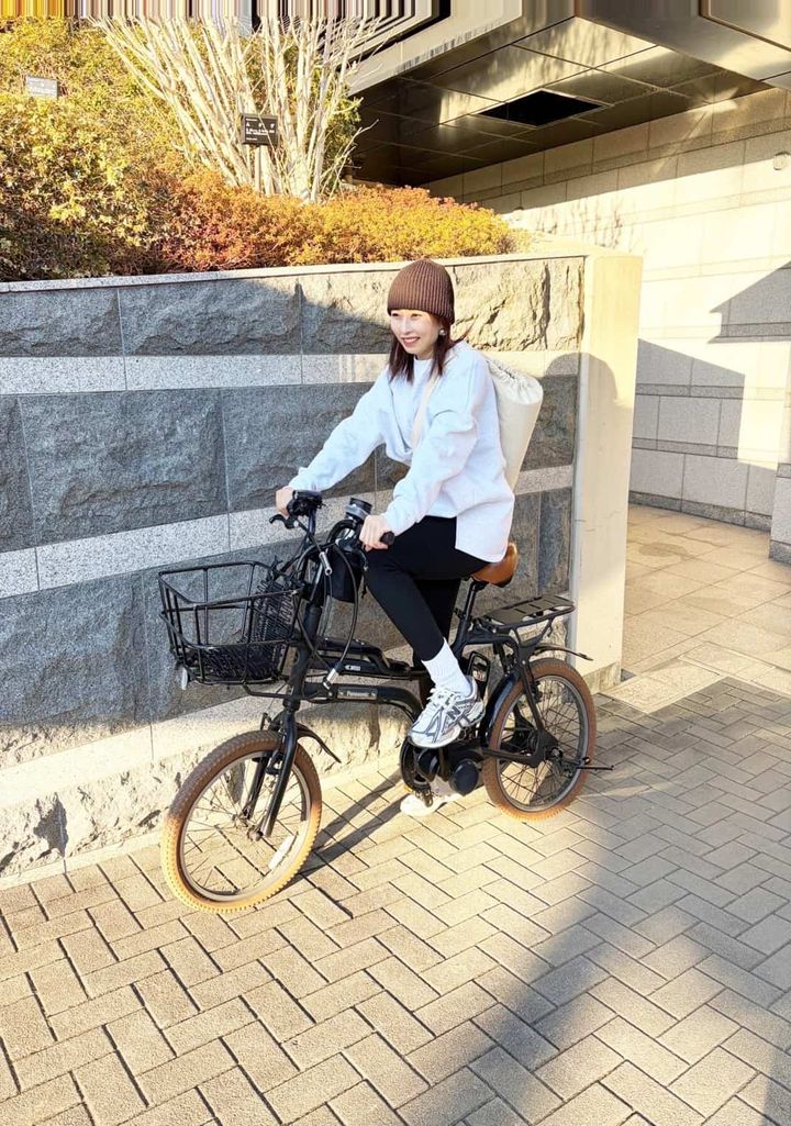 家族でシェアしている折りたたみ自転車は、ピラティスや近所の買い出しにさっと乗れる手軽さが魅力。ママチャリと比べて軽く、駐輪場でも扱いやすいので日常使いにちょうどいい存在です。コーデは動きやすさを重視したブラックのワントーンでまとめつつ、aloのソックスやバイカーパンツでトレンド感をプラス。自転車に乗る時は、シンプルだけど今っぽい、スタイリッシュなスポーティスタイルを意識しています。