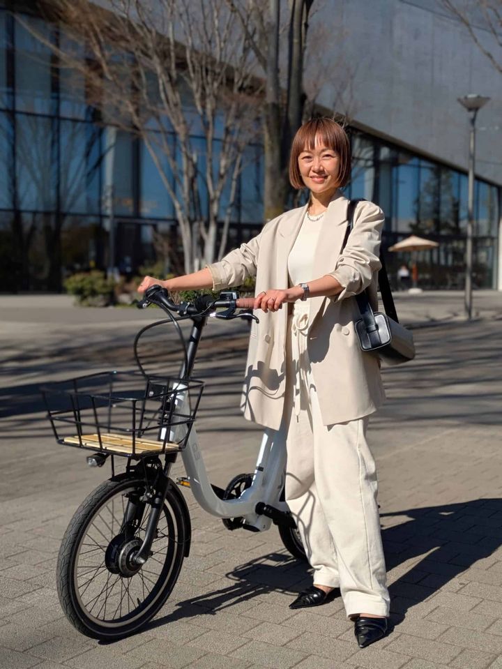 コンパクトながら、しっかりアシストしてくれるので通勤で駅まで、休みの日も近所にと、ほぼ毎日乗っています。通勤スタイルはスウェットパンツにジャケットとミュールを合わせ、抜け感を意識。ホワイトの素材違いで奥行きを出しつつ、小物は黒でキリッと引き締め、ジュエリーで全体のバランスを調整。スクエアバッグは、自転車に乗る時は斜めがけ、綺麗めにカッコよく持ちたいときは短く持って使い分けています。