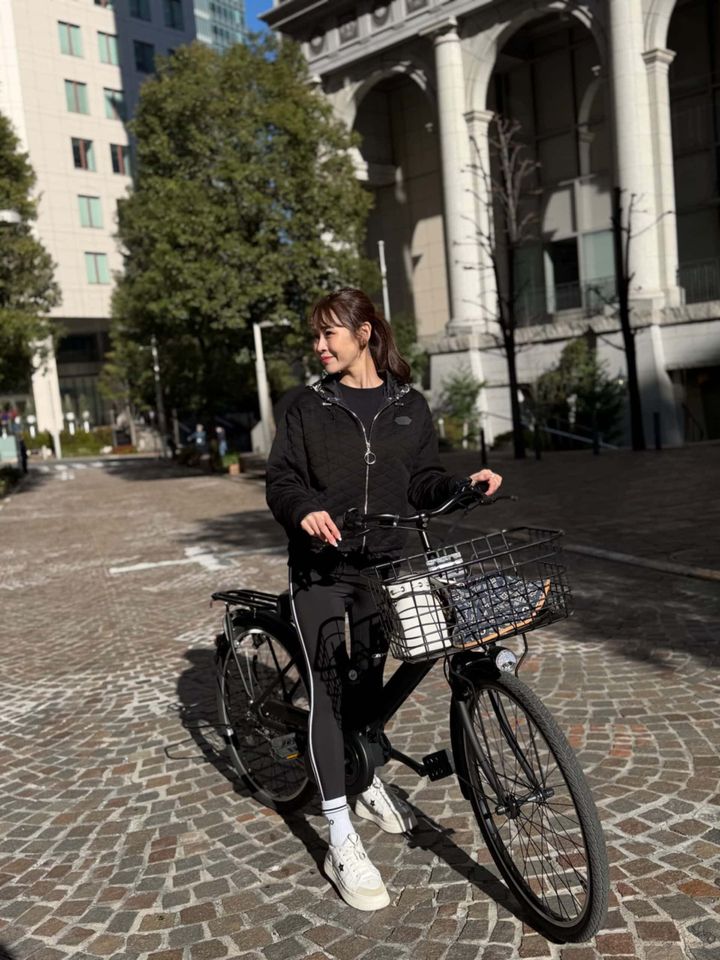 ジムの行き帰りもそのまま街に出られる、ワントーンコーデ。トップスとソックスはaloで揃え、今っぽい雰囲気とアクティブ感を出してます。クロノスのレギンスはフィット感と横のライン効果でスタイルアップが叶います。アウターにはキルティングを合わせて、スポーティに寄りすぎない大人なバランスに仕上げました。自転車カラーも含めたオールブラックで統一感を出しつつ白スニーカーで抜け感を足し、重く見えない印象にまとめています。