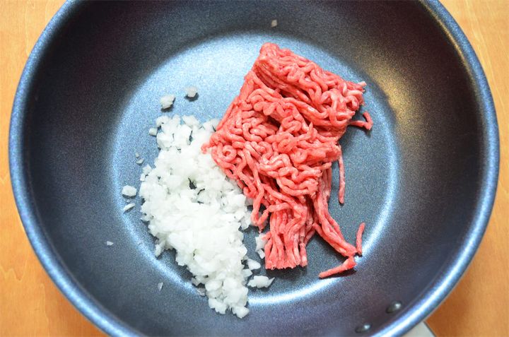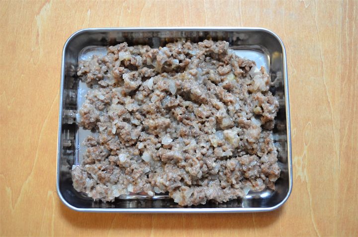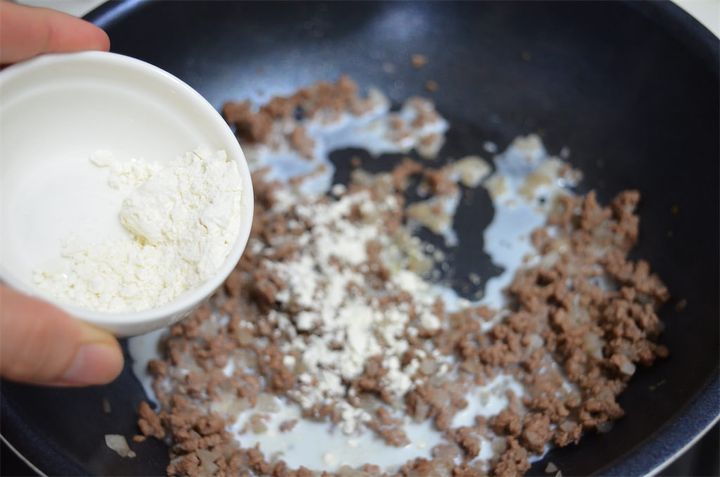 3. みじん切りにした玉ねぎと合い挽き肉を炒め、ひき肉の色が変わったらさらに牛乳、小麦粉、塩・こしょうを加えて炒める。
