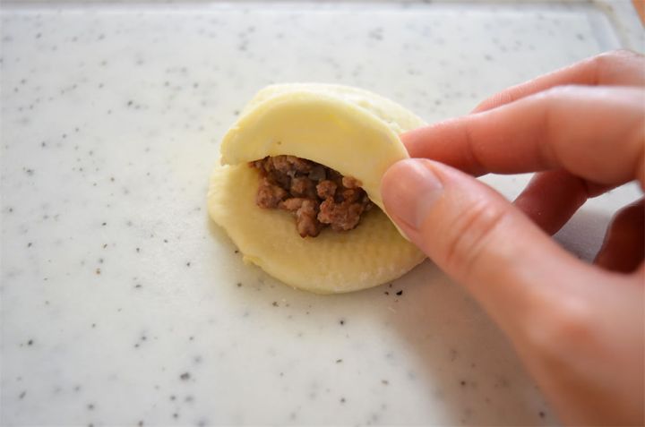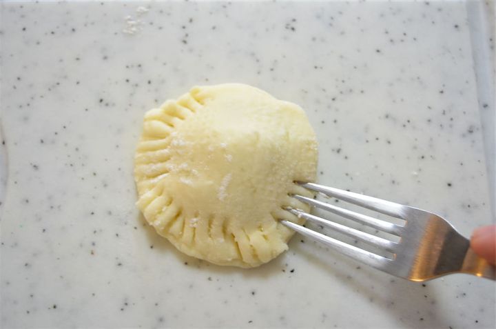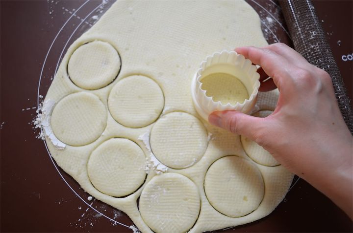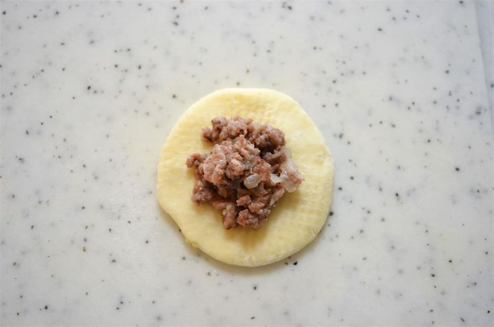 4. 生地を厚さ約5mm程度に伸ばし、大きさの違うお椀を2個用意して型を取る。型を取った生地の中に具を入れ、周りをフォークで押さえる。