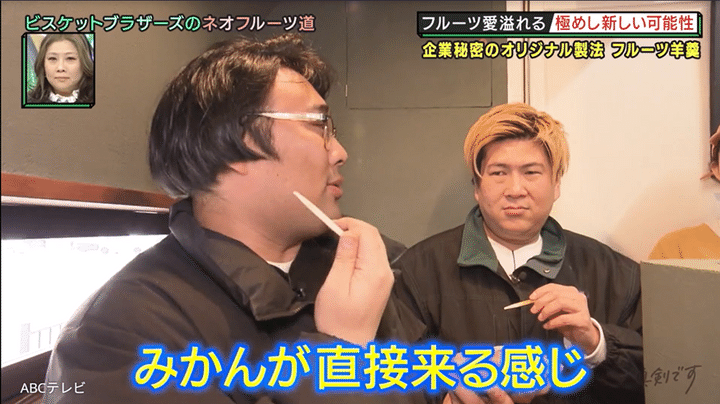 麗紅みかんキュベを試食したお笑いコンビ・ビスケットブラザーズは、「うんま~!」とビックリ! 「とんでもなく高いゼリーで、食べた瞬間に果肉も感じて、1段上に舌触りがある。みかんが直接来る感じ!」「一瞬ようかんの舌触りやけど、みかんが向かってきて、鼻に抜けていく!」などと称賛した。