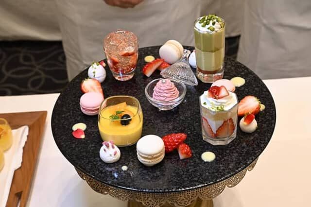 箱根湯本駅から徒歩3分の湯本富士屋ホテルにあるラウンジ ウィステリアでは、宝石を思わせるガラスの食器に、苺のシャンパンジュレやフランボワーズのモンブランなど繊細な盛り付けのスイーツが並ぶプレート「Spring Twinkle ~春のきらめき~」(¥3,000)がフォトジェニック。コーヒーまたは紅茶セット(¥3,600)も用意します。
