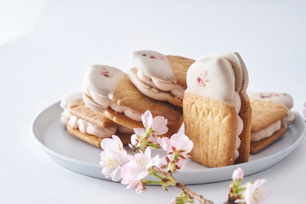 生クリーム入りのバタークリームに、刻んだ桜の塩漬けを練り込んだ「桜あん」を合わせた、なめらかな甘じょっぱさが魅力です。ホワイトチョコレートでハーフコーティングされた香ばしいビスケットでサンドし、仕上げに桜パウダーをふりかけた「桜満開」の仕上がり。