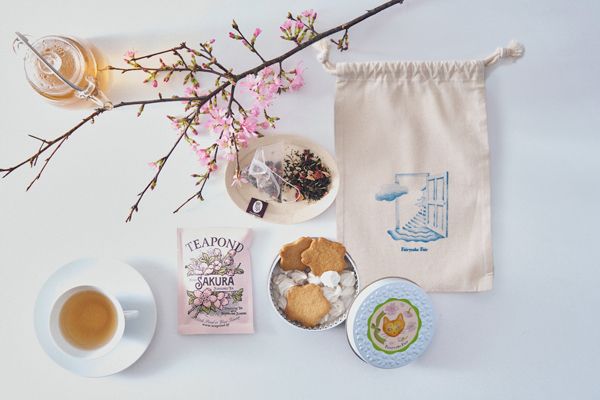 季節限定紅茶「サクラ」と、上記の「プチカドーサクラ」をオリジナルコットン巾着にセット。ベリーや花々が香る春摘みダージリンベースの紅茶と、スイーツの甘じょっぱさが絶妙にマッチします。